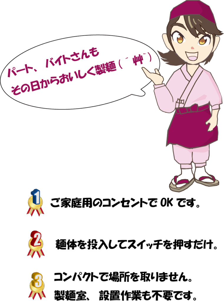 僅か20cmの隙間さえあれば、どなたでも、すぐに自家製麺ができます。 ご家庭用100vのコンセントでOKです!面倒な取り付け工事もありません。 使い方が簡単なので、バイトさんやパートさんでもその日から麺達人です。 十割そば、冷麺、米麺、うどん、パスタ、麺の事なら何でもお任せください。